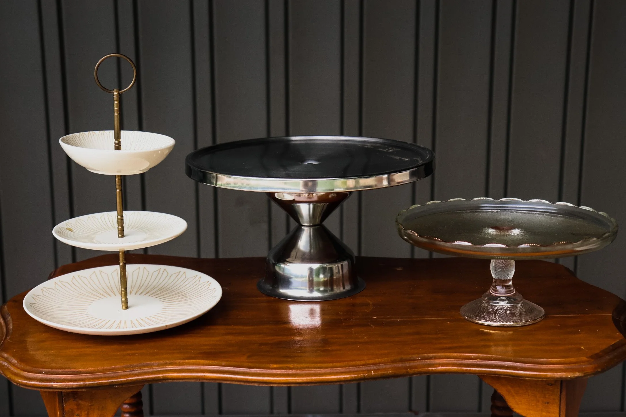 4-tiered dessert stand w/ option of black, silver, or bronze plates